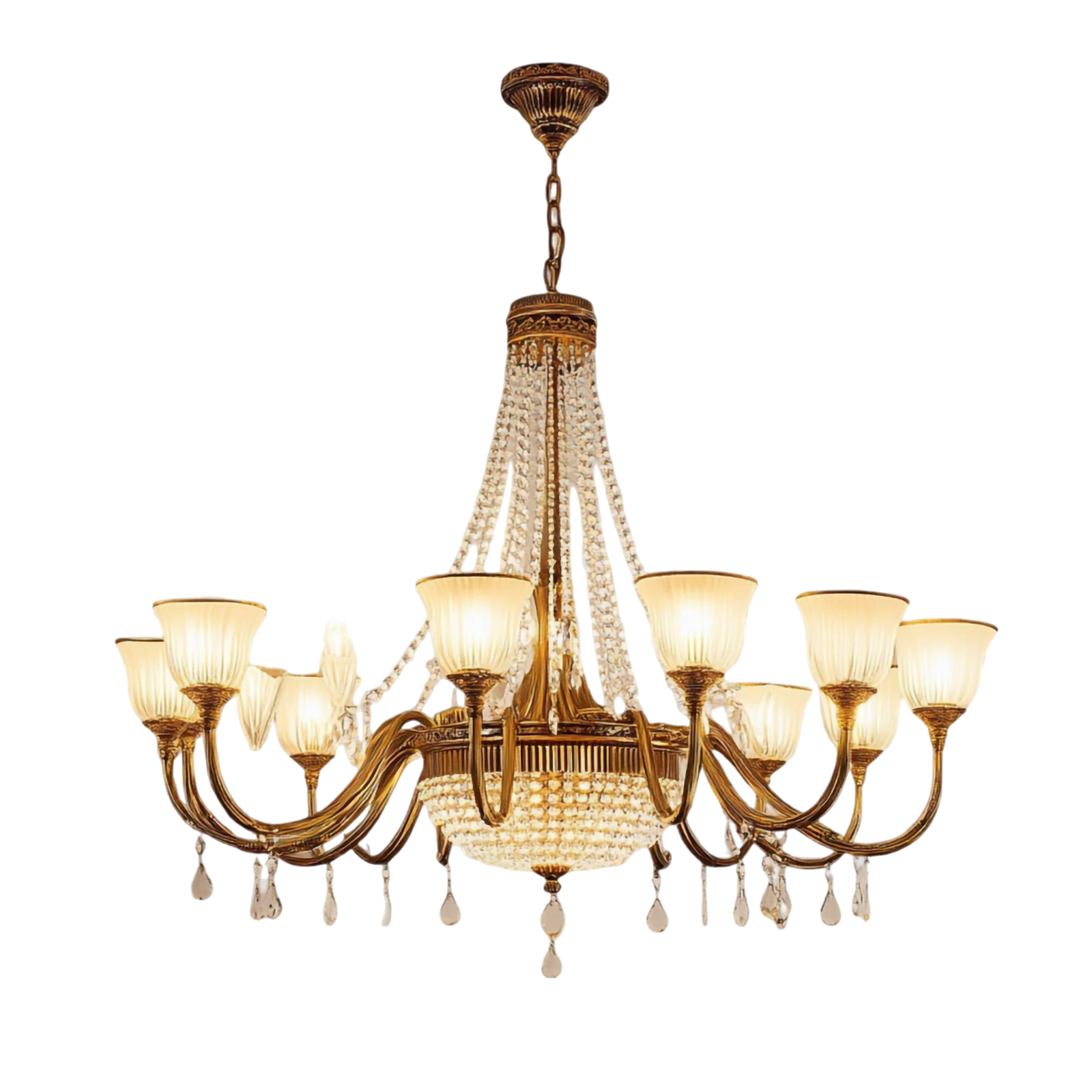 Delicate crystal chains and hanging crystal drops enhance its classic charm, reflecting light beautifully to create a luxurious ambiance. Whether installed in a living room, dining area, foyer, or hotel lobby, this chandelier blends traditional craftsmanship with modern sophistication.