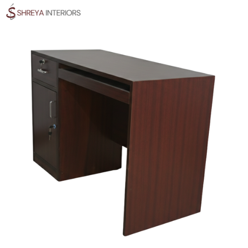 Modern Computer Table: This product image features a functional computer desk from Shreya Interiors crafted with a dark reddish-brown mahogany wood finish. The desk is designed with a spacious flat top and a dedicated sliding keyboard tray positioned underneath for ergonomic use. For storage, the left side of the unit includes a small upper drawer and a larger lower cabinet, both of which are equipped with silver handles and integrated locks with keys.